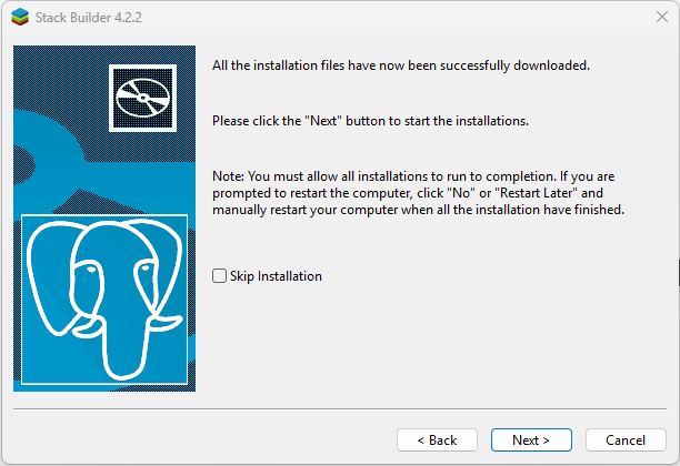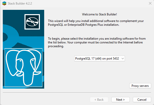 Stack Builder poprosi nas o wybranie instalacji Postgres którą chcemy „modyfikować”, wybieramy naszą.