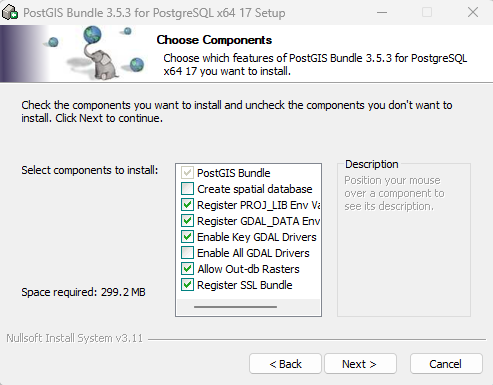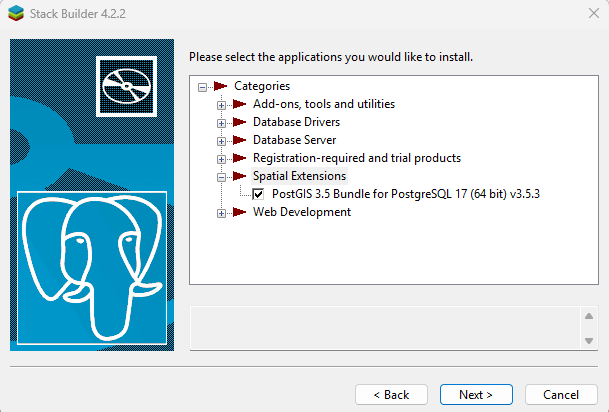 a potem doznaczamy co Stack Builder ma nam doinstalować (u nas PostGIS).