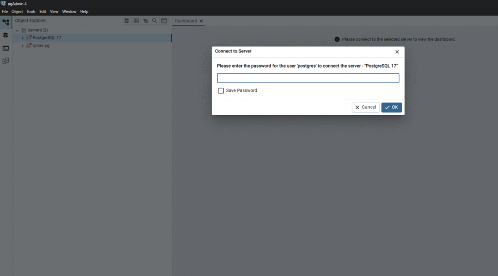 wybieramy naszą bazę i podajemy do niej hasło (u mnie jest więcej baz, nas interesuje aktualnie PostgreSQL 17)