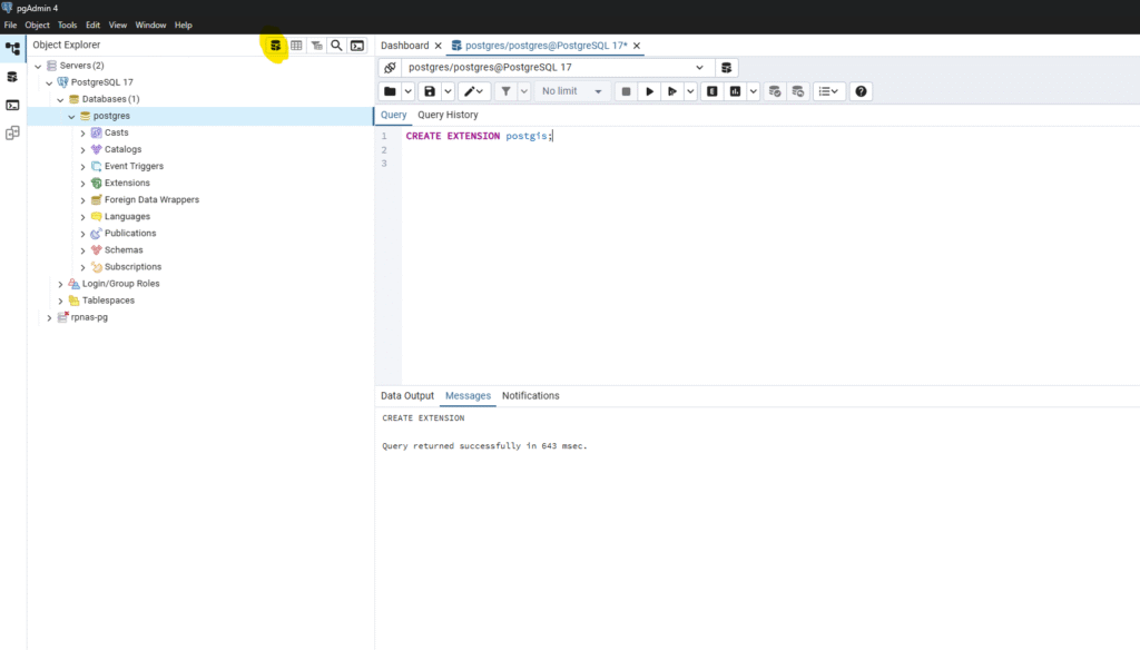 i klikamy w strzałkę powyżej. (Execute Script). To instaluje nam w bazie funkcje postGIS.