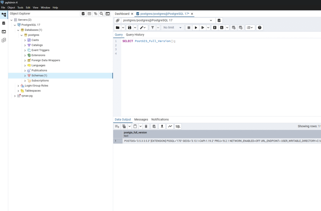 Następnie możemy sprawdzić czy postGIS został poprawnie zainstalowany poprzez wpisanie i uruchomienie skryptu jak powyżej: