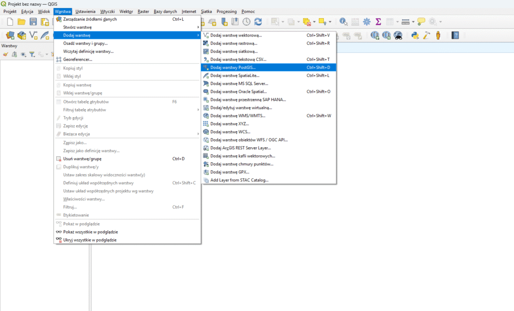 • Skonfigurowaliśmy połączenie z postgreSQL w QGIS