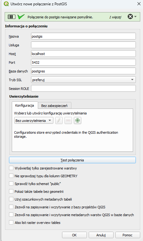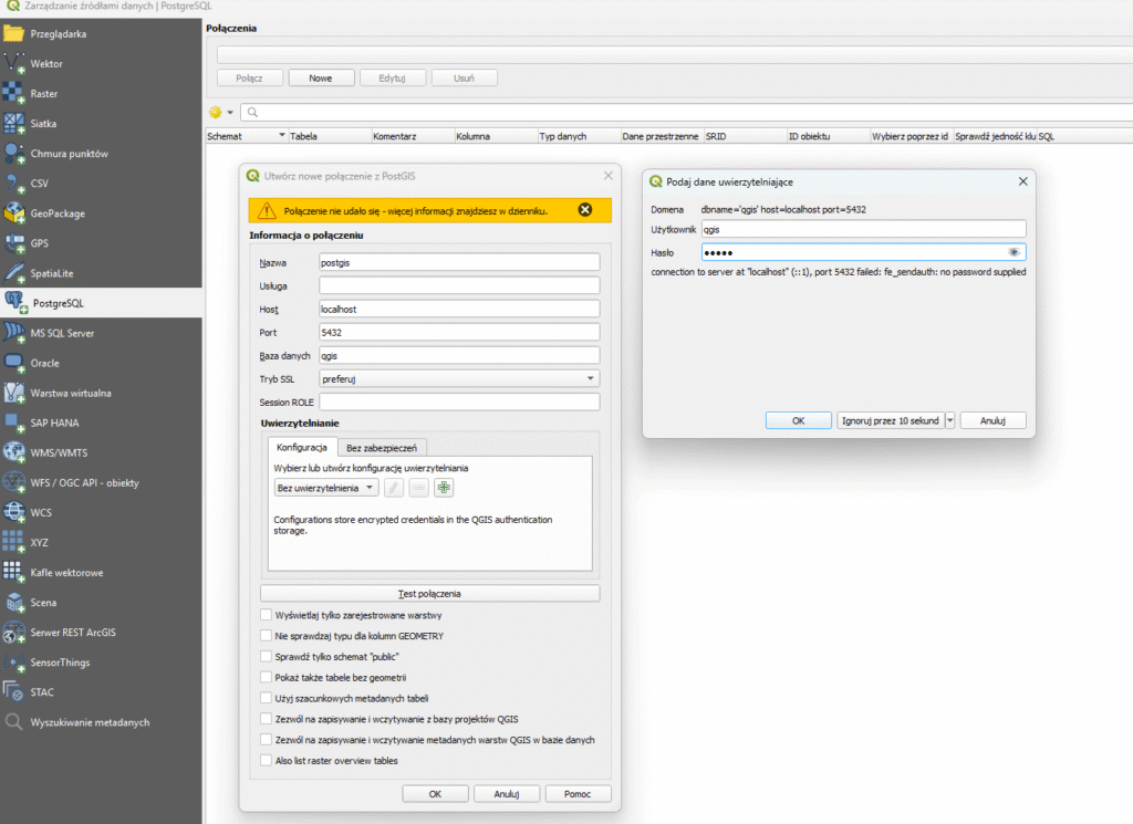Teraz w teorii moglibyśmy się już zalogować z poziomu QGIS i sprawdzić czy serwer zezwala nam na połączenie.
